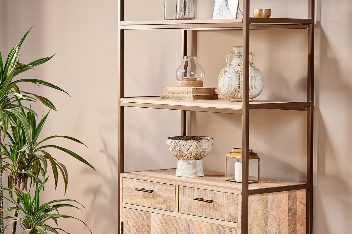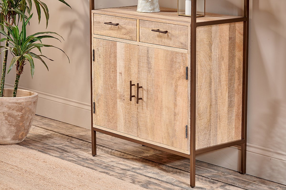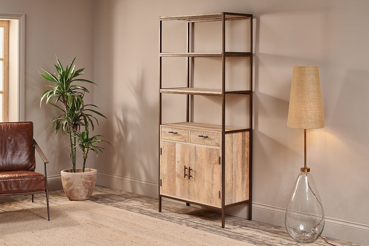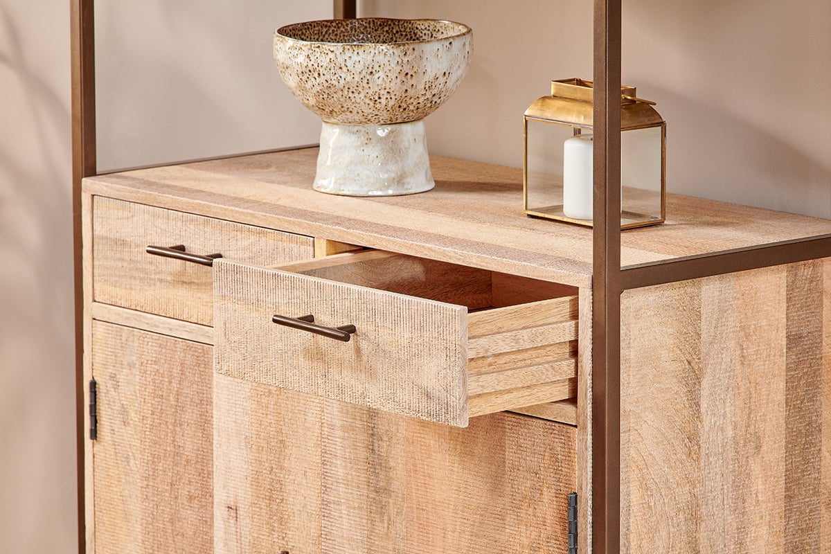 Le meuble de rangement Dasai en bois de manguier est un meuble extrêmement polyvalent. Il trouve aussi bien sa place dans une cuisine, pour ranger la vaisselle et les verres, que comme support pour des livres et des objets de décoration dans un salon ou un bureau. Fabriqué en bois de manguier issu de forêts gérées durablement, il a été sablé pour sublimer sa patine naturelle et obtenir une riche finition texturée. Le meuble Dasai est doté de deux portes d'armoire pratiques qui s'ouvrent sur une étagère en bois. Deux tiroirs se trouvent au-dessus, ainsi que trois étagères ouvertes offrant des espaces de rangement et d'exposition pratiques. Ses poignées en fer forgé et roulé à la main font écho à son élégante structure en fer.