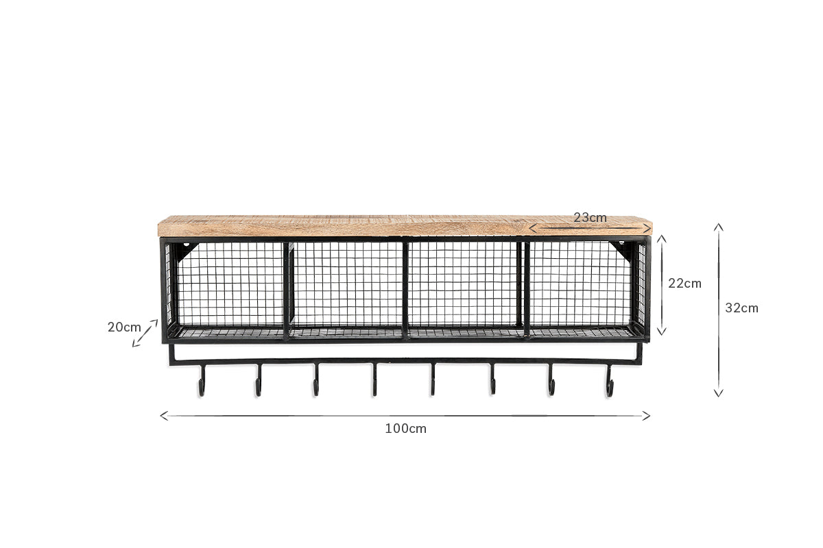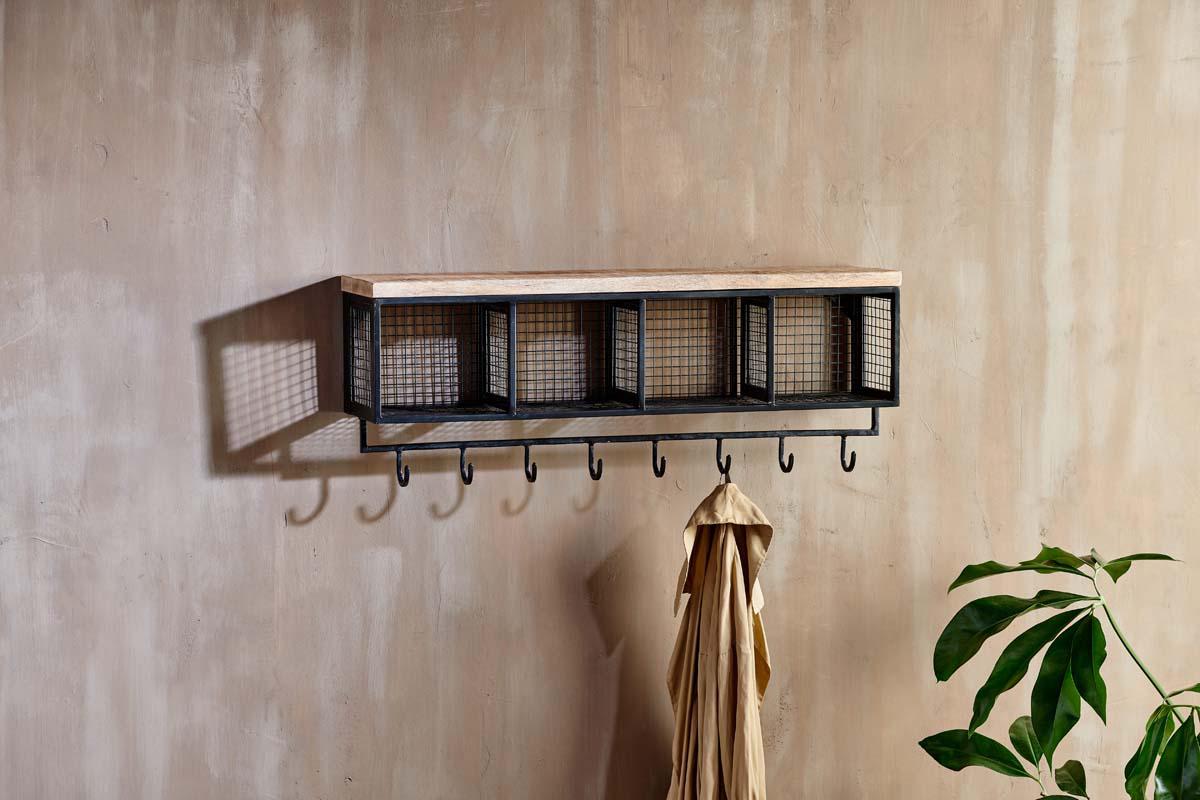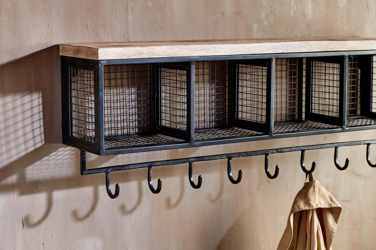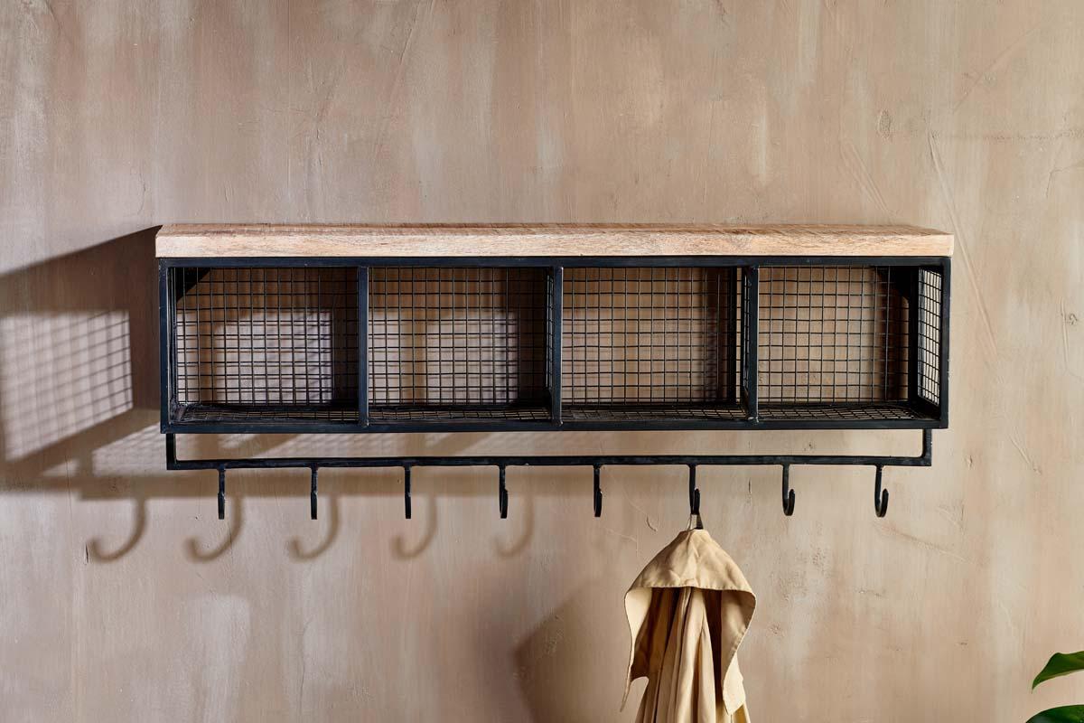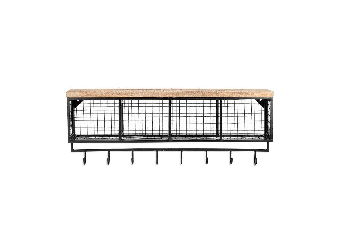 L'étagère Hasa Cubby allie le fer industriel au bois de manguier durable, pour un résultat à la fois fonctionnel et élégant. Elle comprend quatre compartiments et une rangée de huit crochets. Idéale pour ranger de petits accessoires comme des chapeaux et des gants, avec des manteaux en dessous.