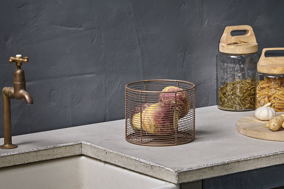 La forme cylindrique de nos paniers Inkollu est idéale pour ranger et présenter divers objets, des ustensiles dans notre plus petit panier aux fruits, légumes et pain dans nos plus grands modèles. Ces paniers sont sculptés dans du fil de fer et finis dans une chaleureuse teinte laiton vieilli.