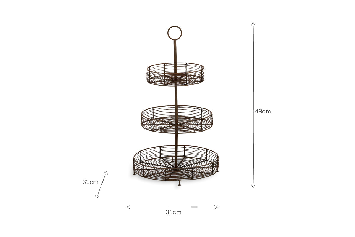 Le présentoir Inkollu, en fil de laiton vieilli, possède trois niveaux pratiques. Son design original en fait un accessoire idéal pour ranger fruits et légumes ou présenter des gâteaux faits maison. Grâce à sa poignée, il est facile à déplacer.