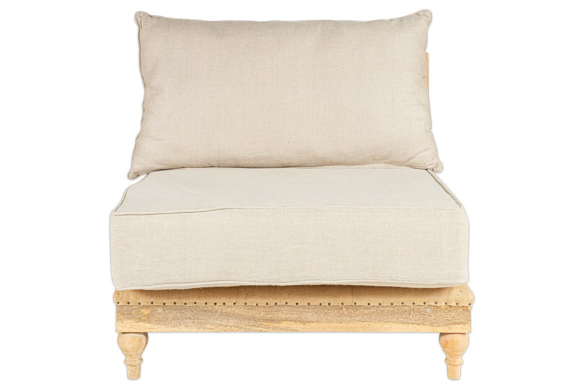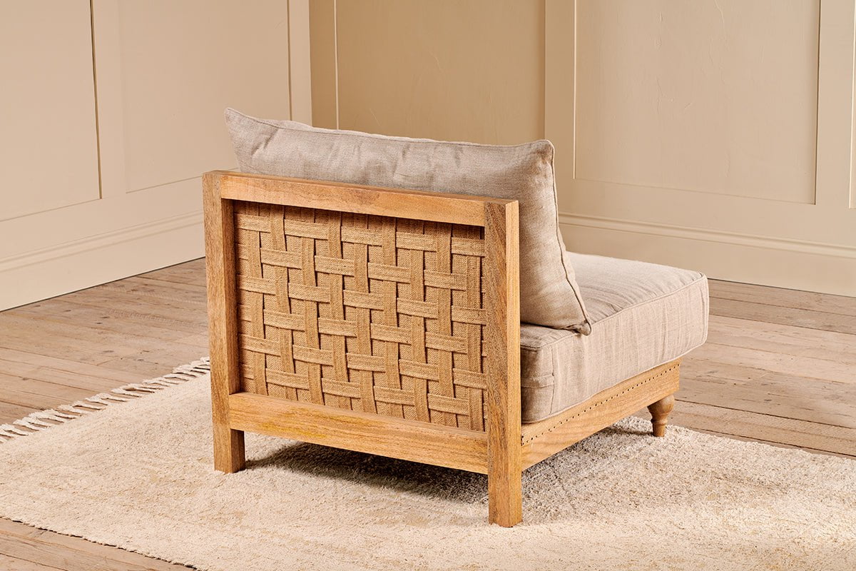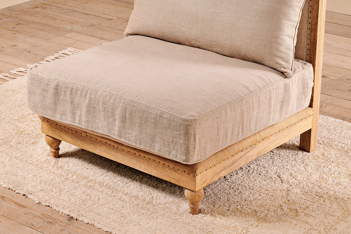 Le module Krissa fait partie de notre collection de canapés modulables. Sa structure, réalisée avec expertise en bois de manguier massif, présente des pieds finement tournés. Le dossier et l'assise de ce module d'angle sont revêtus de lin naturel, tout comme les coussins d'assise fermes et les coussins de dossier moelleux. Le dossier déstructuré de cette pièce élégante lui confère une véritable originalité. Le tissage de toile de jute témoigne du savoir-faire artisanal et de la qualité de sa fabrication. Ajoutez autant de modules que nécessaire pour créer un canapé sur mesure.