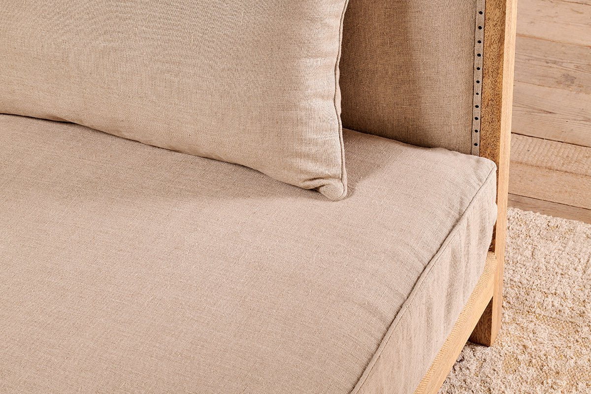 Le dossier et la base de ce canapé d'angle sont revêtus de lin naturel, tout comme les coussins d'assise fermes et les coussins de dossier moelleux. Le dossier déstructuré de cette pièce élégante lui confère une véritable originalité. Le tissage de la toile de jute témoigne du savoir-faire artisanal. Les pieds présentent un détail tourné sobre.