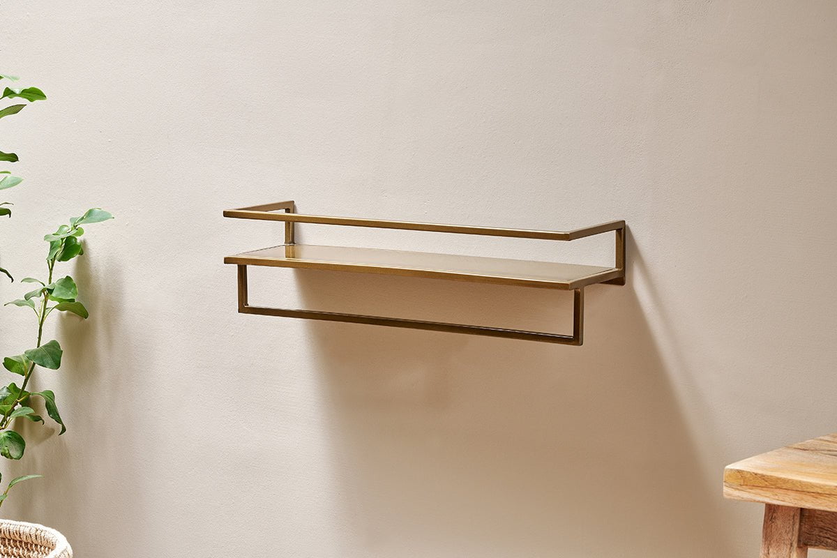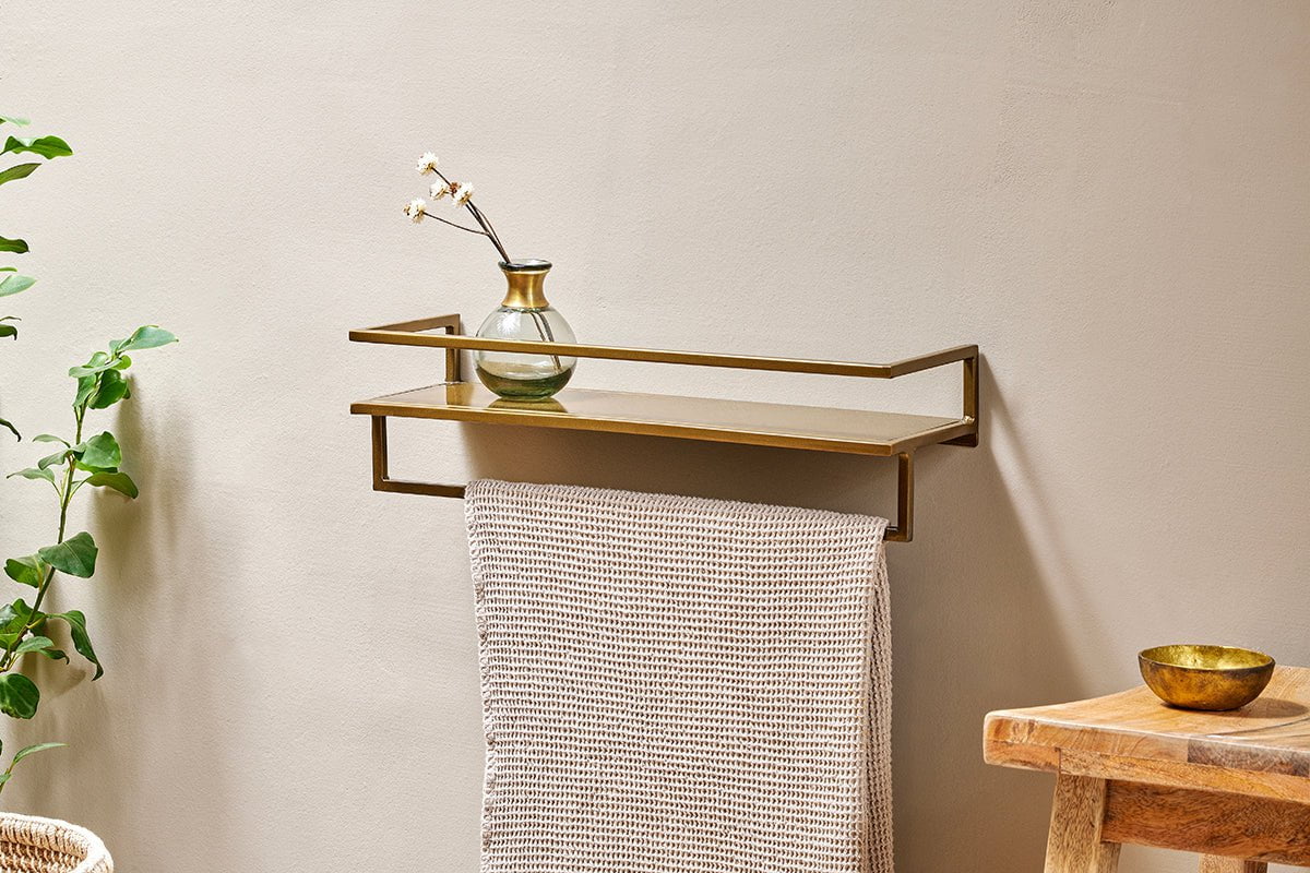 Modernisez votre salle de bain avec l'élégante étagère murale Mahi et son porte-serviettes intégré. Les tons chauds du laiton et le design épuré de l'étagère et du porte-serviettes Mahi confèrent à votre salle de bain une allure élégante et contemporaine. L'étagère, de dimensions généreuses, peut accueillir une variété de produits de toilette et d'accessoires, tandis que le porte-serviettes robuste est idéal pour une serviette de toilette et un gant de toilette. L'étagère et le porte-serviettes Mahi se fixent au mur. Veuillez vous assurer d'utiliser des fixations murales adaptées au type de mur sur lequel vous les installez.