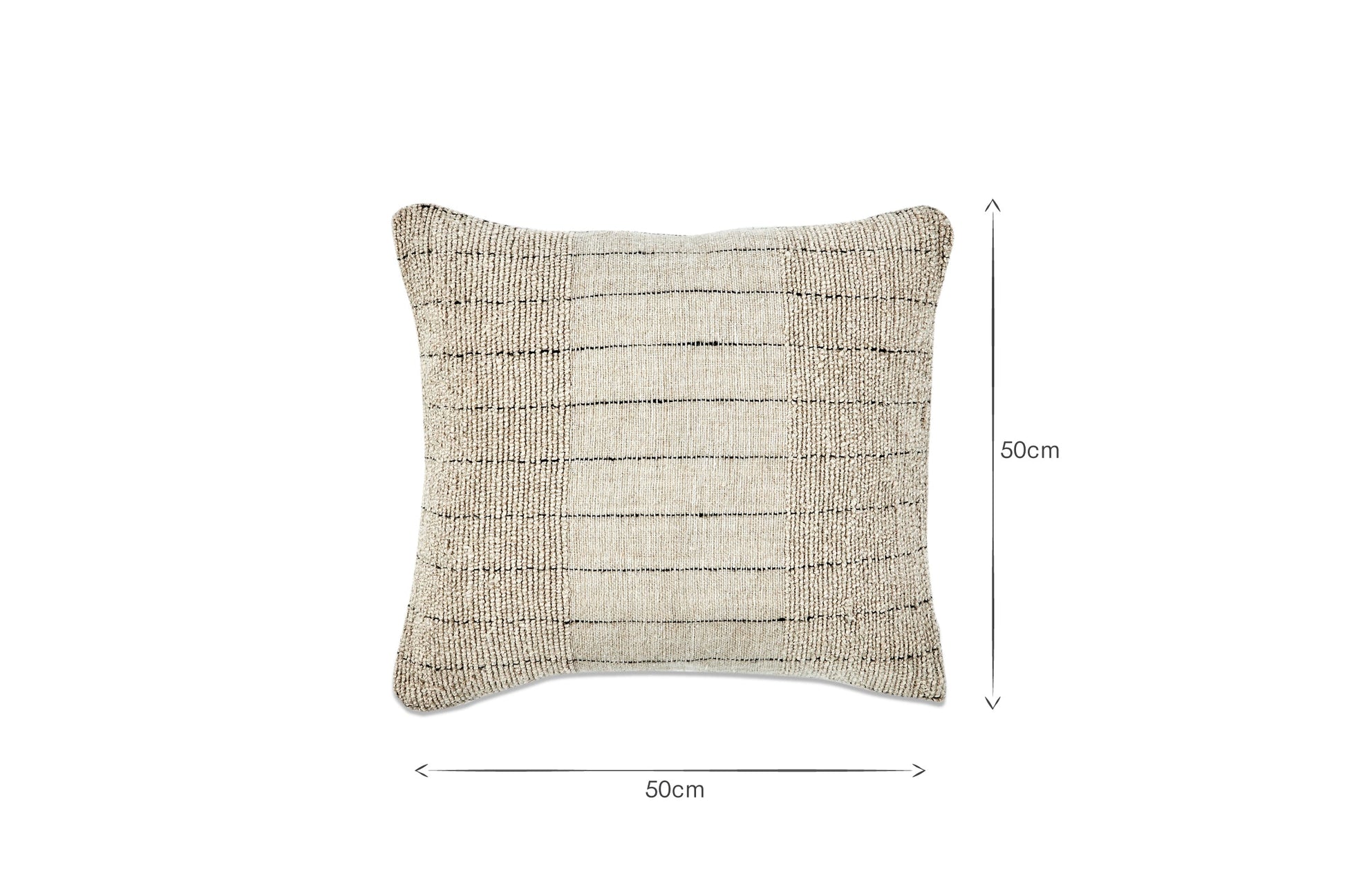 Nos housses de coussin Mayla sont tissées à la main en lin et en coton, pour un style décontracté et une texture agréable. Leurs tons neutres sont rehaussés de fines lignes noires cousues à la main, créant un motif subtil. À associer avec notre mobilier.