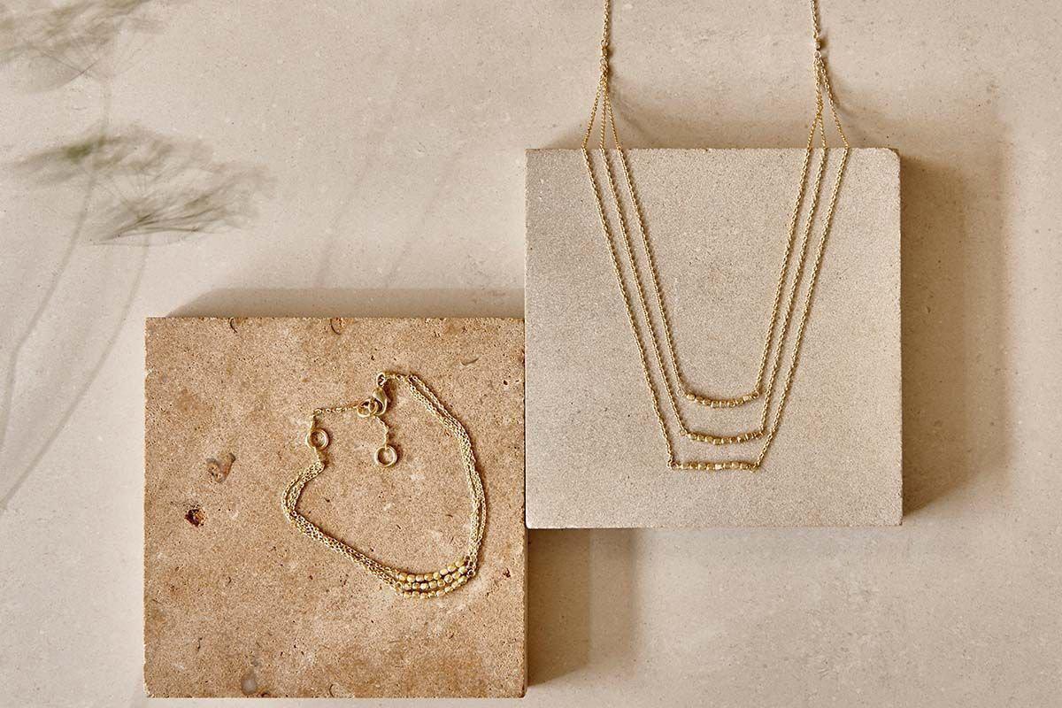 Ce joli bracelet Mura est magnifiquement réalisé à la main ; ses trois rangs sont habilement confectionnés à partir de perles plaquées or taillées à la main.