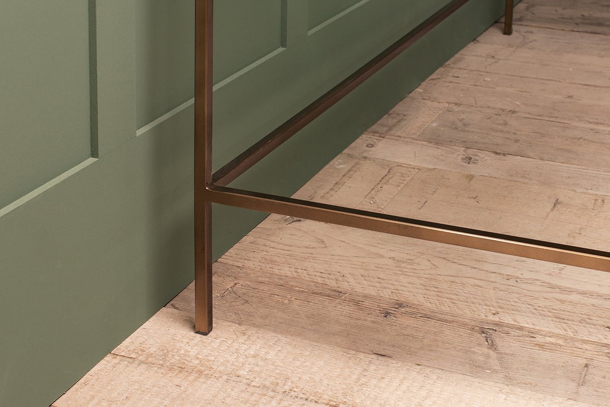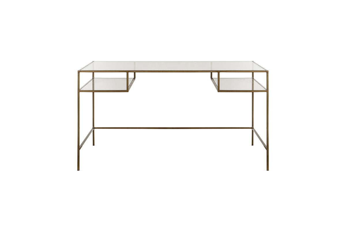 Avec sa fine structure en laiton et ses généreux panneaux de verre, notre bureau Nakura allie élégance et fonctionnalité. Robuste et bien conçu, il apportera une touche de style à votre bureau ou votre chambre. Le laiton confère une ambiance chaleureuse tandis que le plateau en verre lui apporte une note contemporaine. Sa grande surface permet d'accueillir confortablement un ordinateur portable et autres accessoires. Deux compartiments facilitent le rangement de vos affaires tout en laissant le plateau dégagé. Pour une esthétique raffinée, associez-le à une chaise de bureau en laiton.