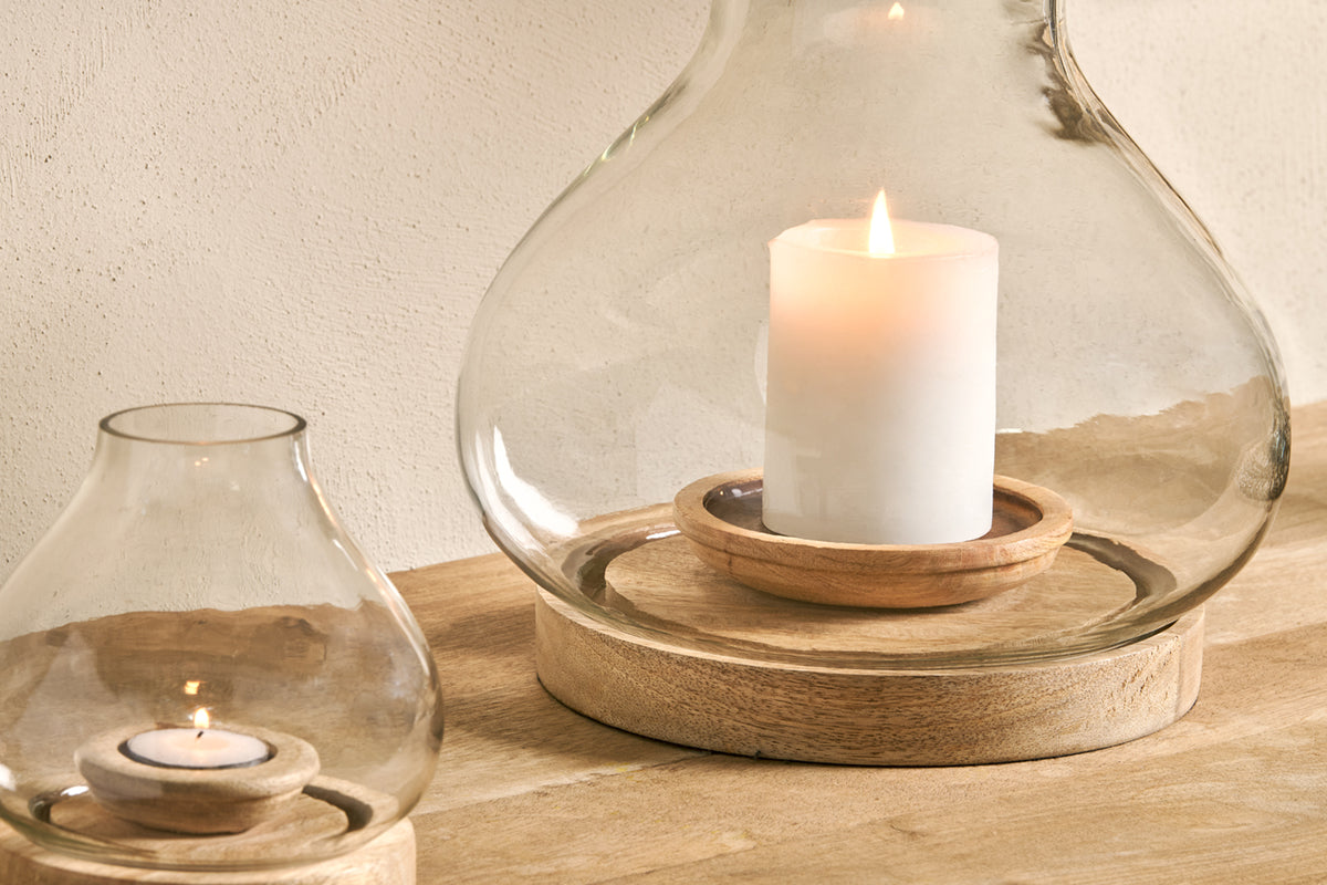 Parfaites pour créer une ambiance chaleureuse en soirée, nos élégantes lanternes Naryla sont dotées d'une ampoule en verre qui s'intègre harmonieusement dans un socle en bois de manguier massif. Le contraste élégant entre le bois naturel et le verre recyclé est du plus bel effet. Grâce à leur enveloppe en verre, elles sont idéales pour une utilisation en extérieur.