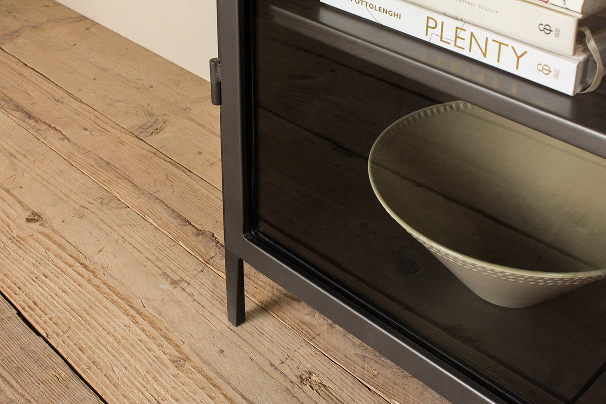 Ce meuble robuste et spacieux est idéal pour exposer vos objets préférés, comme de la verrerie ou de la vaisselle. Fabriqué en fer résistant avec des portes vitrées transparentes, son design utilitaire épuré s'intègre à presque tous les intérieurs. Ses dimensions en font un élément décoratif remarquable, tandis que ses tons gris foncé lui confèrent une touche d'élégance. Un meuble véritablement intemporel, à la fois pratique et raffiné.