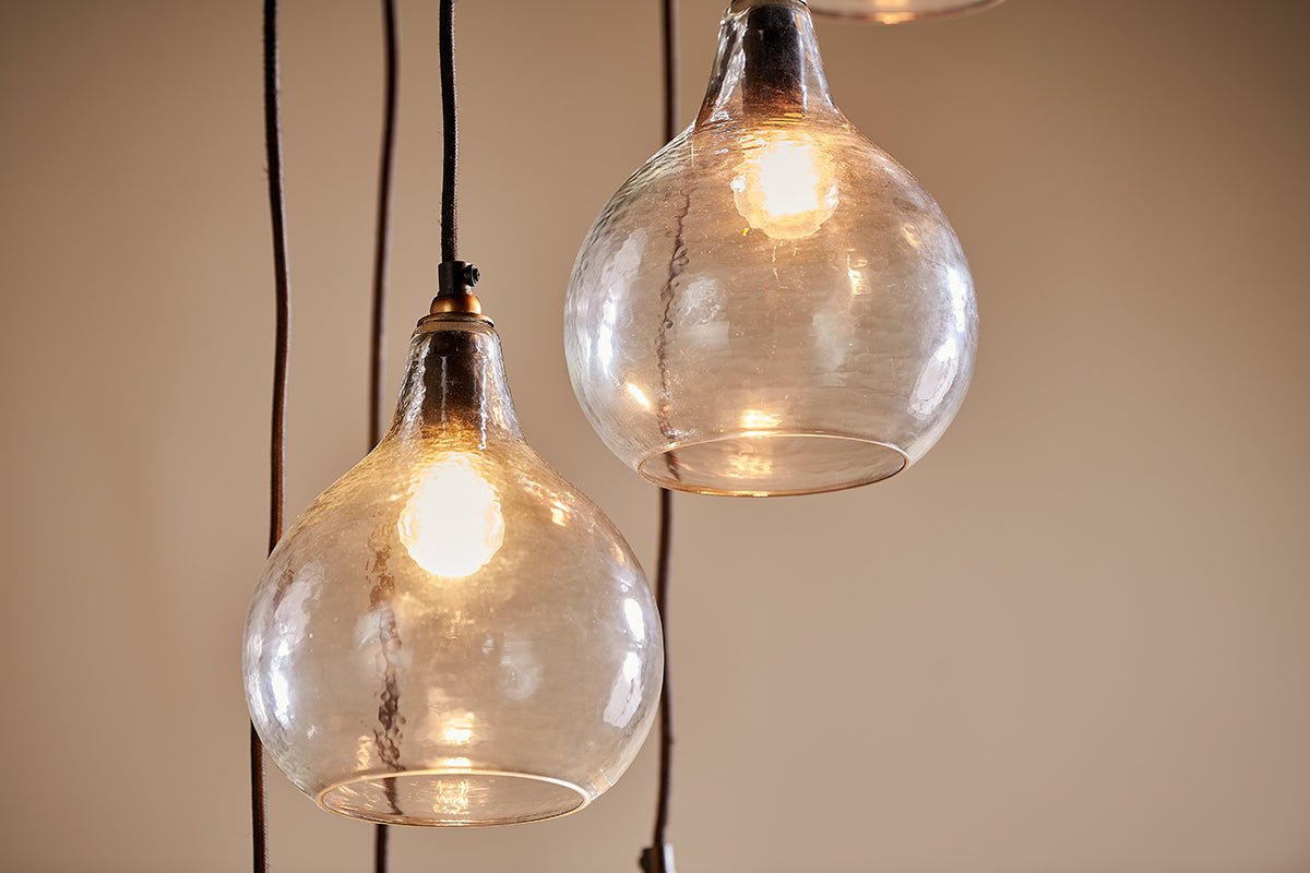 La suspension Zia, véritable pièce maîtresse, se distingue par son design. Composée de six luminaires en verre recyclé en forme de larme, de hauteurs différentes, elle offre une alternative contemporaine au lustre traditionnel. Installez-les dans un hall d'entrée ou une cage d'escalier pour créer un point focal, ou encore au-dessus d'une table à manger. Chaque suspension Zia est fabriquée à partir de verre recyclé et ses câbles en tissu noir sont fixés à une élégante rosace de plafond en laiton.